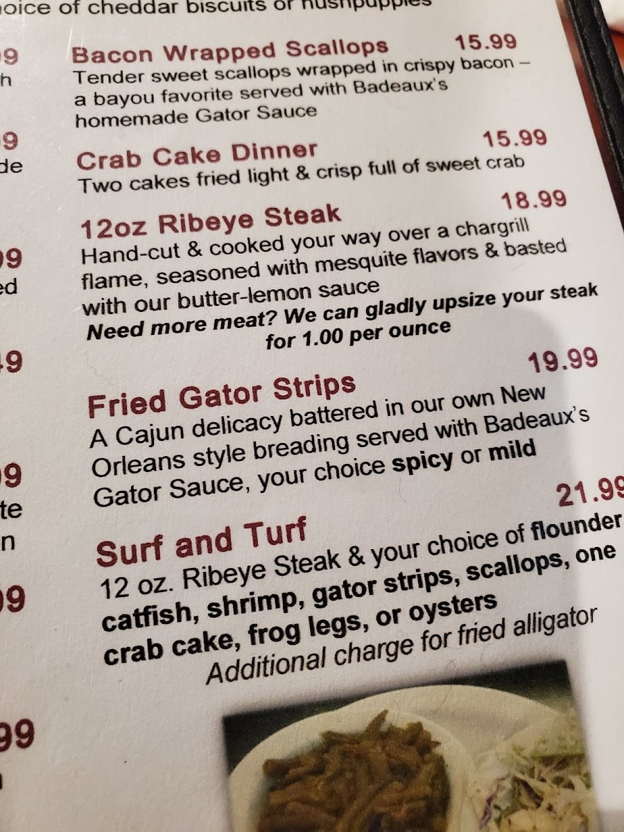 A cajun delicacy battered in our own new orleans style breading served with badeaux's gator sauce, your choice spicy or mild.