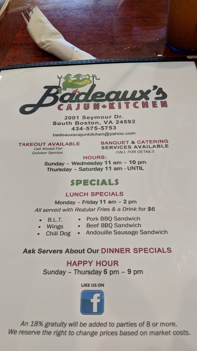 Badeaux's Seafood & Grill offers a vibrant and diverse menu, combining Southern comfort food with a rich selection of seafood dishes, perfect for a satisfying meal in South Boston. Whether you're a fan of hearty burgers, savory seafood, or classic Southern sides, there's something for everyone at this local favorite.